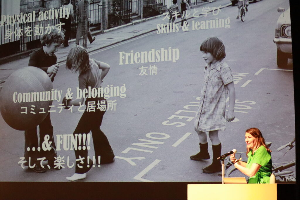 基調講演では、アリス氏がプレイストリートを始めることになったきっかけや、それが英国中に広がるまでのプロセス、そしてプレイストリートの実施によって「住みやすい住宅環境」「市民意識の醸成」「コミュニティづくり」「子どもの健康」など、まちに様々な効果をもたらすことを話していただきました。